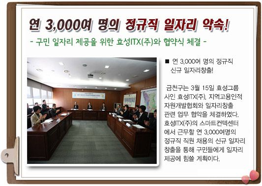 지난 3월 15일 있었던 금천구청, 지역고용인적자원개발협회, 효성TX(주) 간의 업무협약식 기사내용입니다.