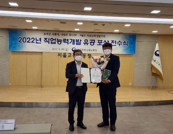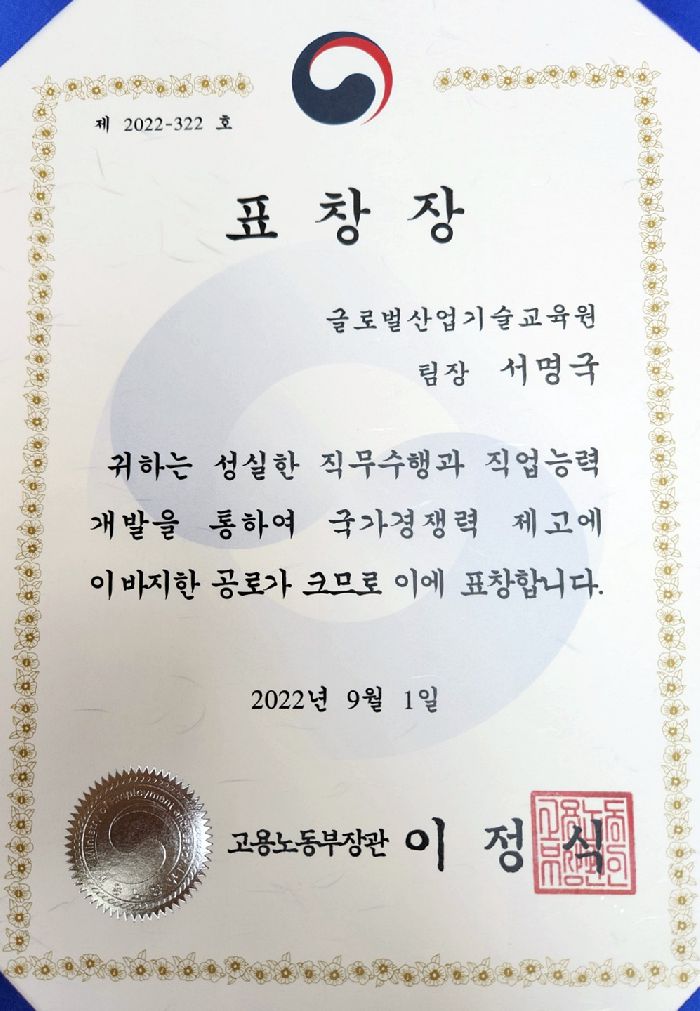 고용노동부장관 수여 표창장 수상
