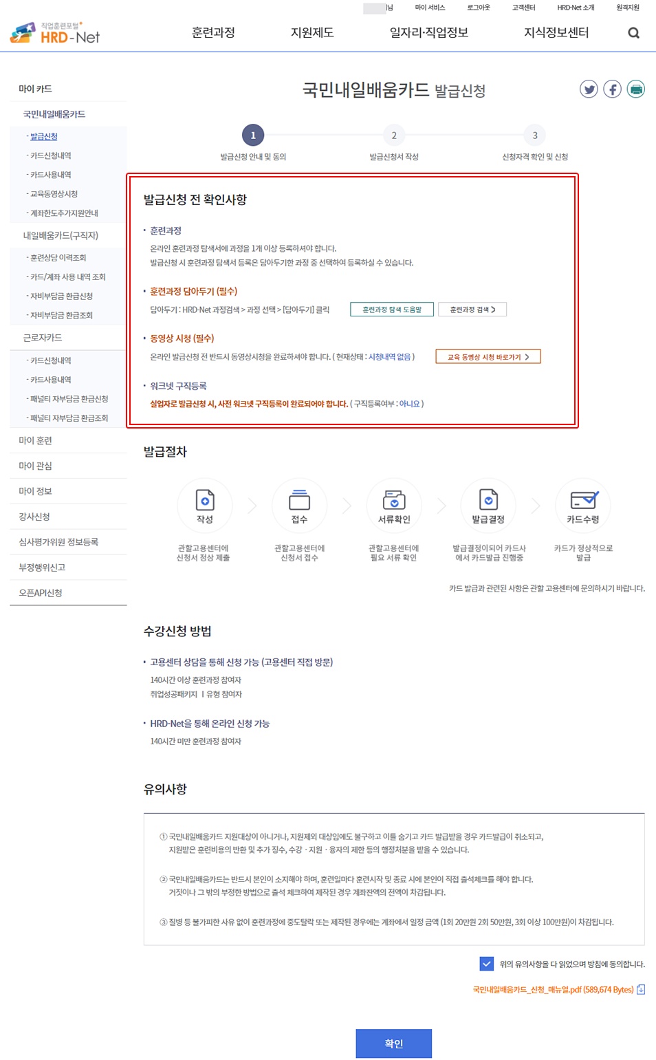 ☞클릭! 담당 주무관이 알려주는 [국민내일배움카드 온라인 신청 법] 3분 34초부터 훈련과정 진단,신청 내용이 나옵니다!! ---------▼ 카드신청 전 확인사항(빨간 네모)
